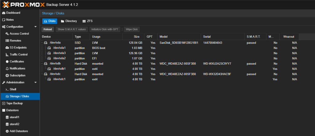 I was going for cost efficiency here. I happened to have two 4TB 3.5″ WD drives from one of my old machines that was previously serving my media and files. These did not go into the new server because it uses 2.5″ drives.