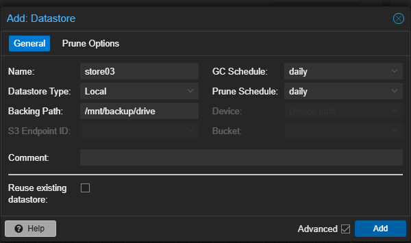 Backing path is going to be the mounted drive directory that you want PBS to use for that datastore. In my case, since I had two drives, I created two datastores with the appropriate backing paths. I did not change any of the other settings and left them as default.