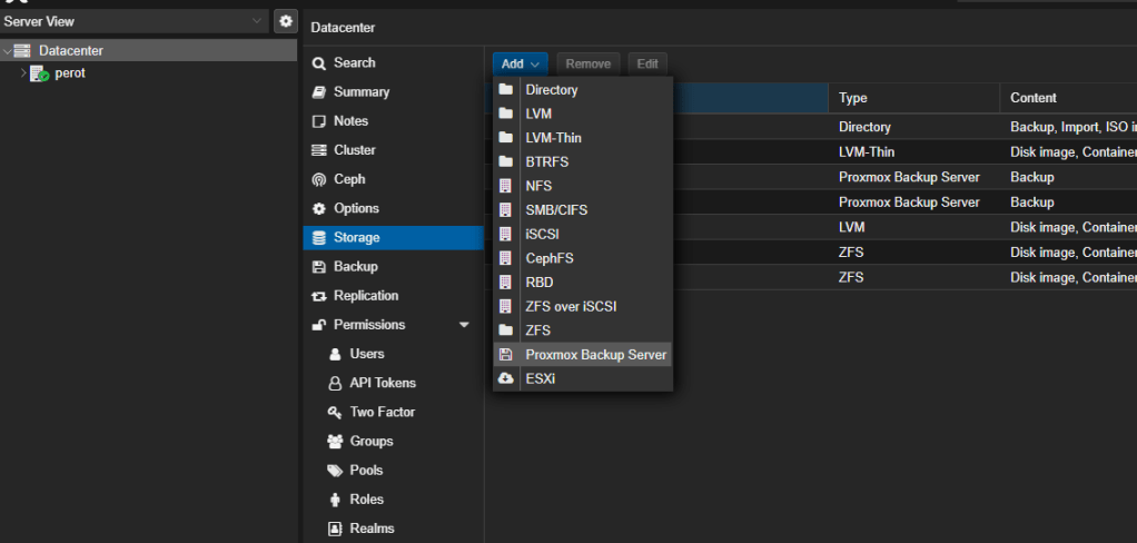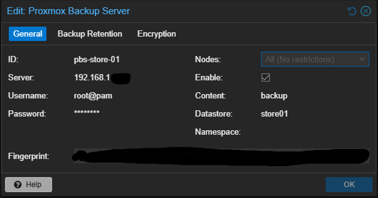 Once you click Add basically all you need is the IP of your PBS machine, the username (in proxmox format e.g. root@pam) and the password. The “Datastore” option will be the name of the datastore you created on the PBS machine.