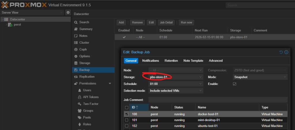 From there, you can start making backups either on demand or on a schedule from Proxmox VE and they will get picked up by PBS. For example, I have this one VM backing up every day to the PBS machine (set in the storage option of the Datacenter -> Backup screen):